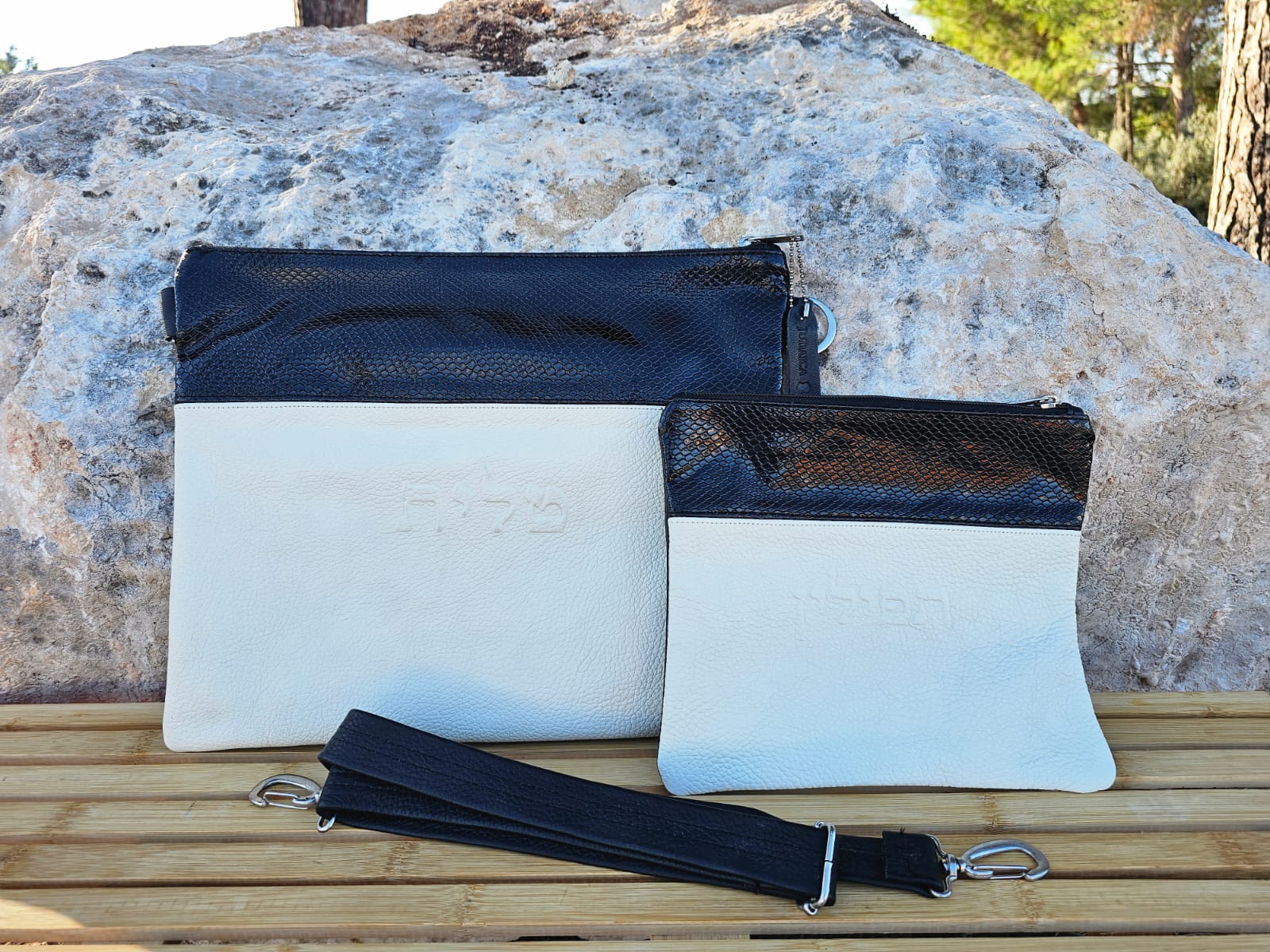 תיק לטלית ותפילין עור שחור לבן מבריק עם חגורה