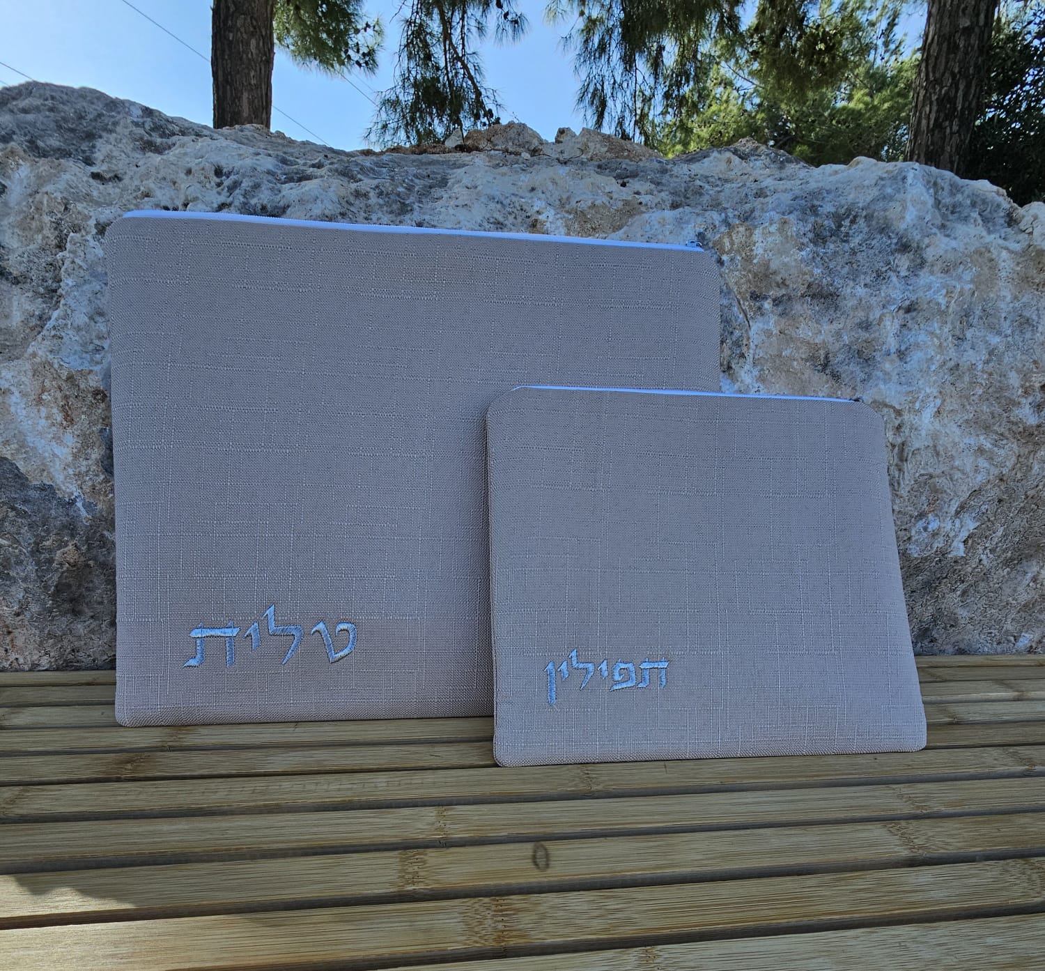 כיסוי טלית ותפילין דמוי עור עם ידית דגם יברכך דמוי פשתן עם רקמת שם